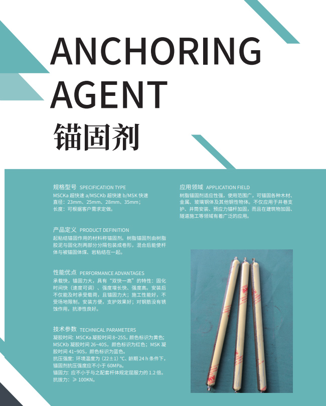 产品具有保质期长,锚固强度高,方便施工等优良性能。可与金属或玻璃钢锚杆配套使用,在地下工程、边坡支护、立井的装备安装、建筑物的构件连接、设备基础的锚固等均得到广泛的应用。是现代锚固工程中的锚固材料。树脂锚固剂参数锚固剂型号MSCK2535MSK2550MSK2570MSCK2550MSCK2850等